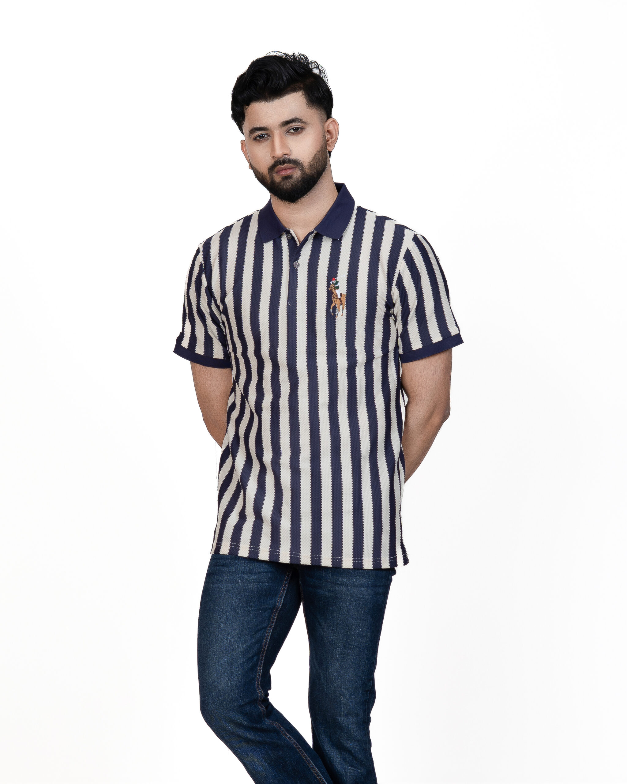 - Collar: Classic polo collar with a two-button placket